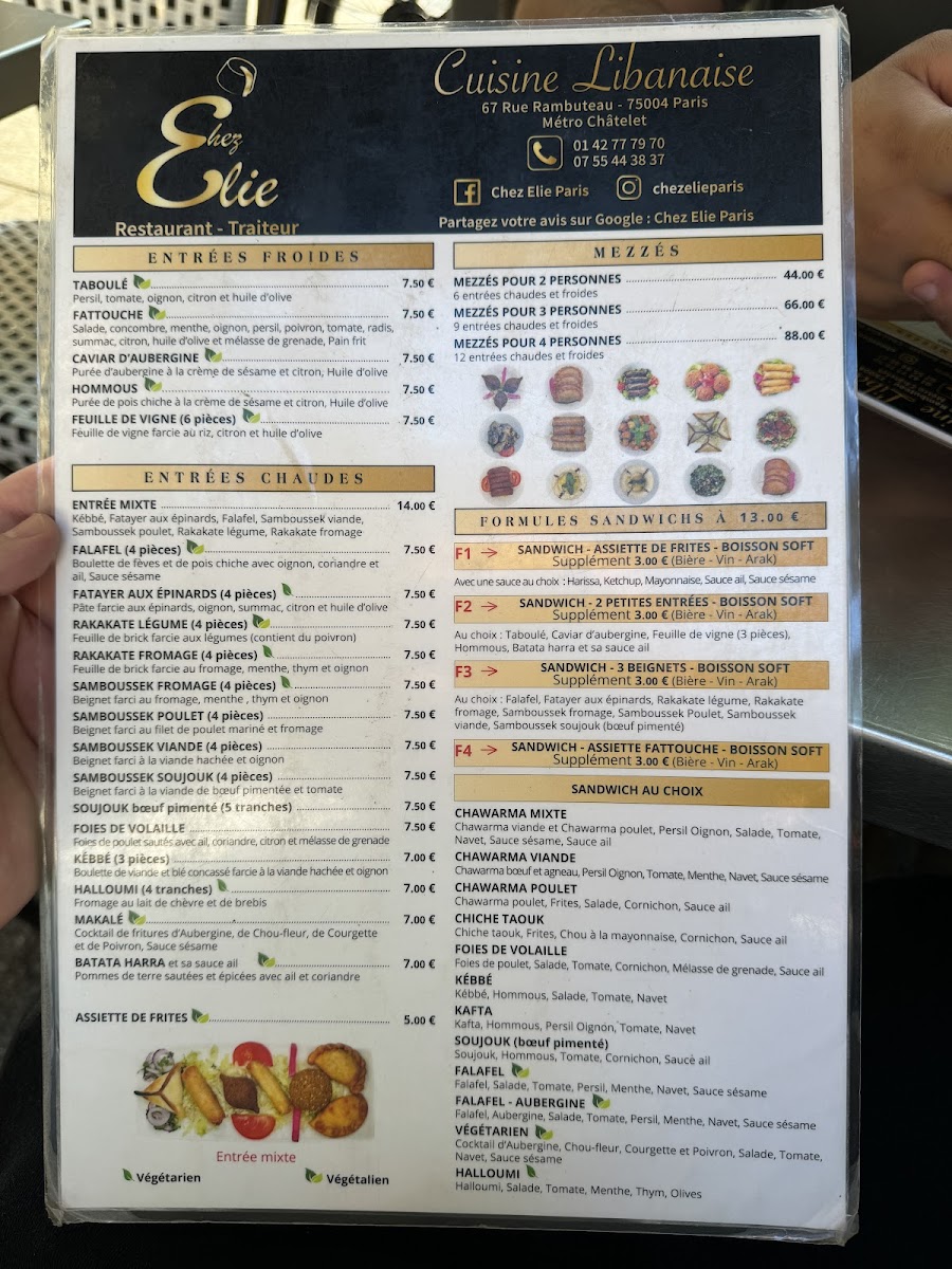 Welcome to Chez Elie, a delightful gem in the heart of Paris! Nestled at 67 Rue Rambuteau in the vibrant 4th arrondissement, this charming restaurant libanais offers a warm embrace to all who enter, and it's clear that the hospitality is as rich as the flavors served from the kitchen. With glowing reviews from satisfied patrons, it’s evident that Chez Elie has carved out a place in the hearts of food lovers and travelers alike.